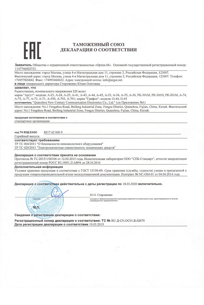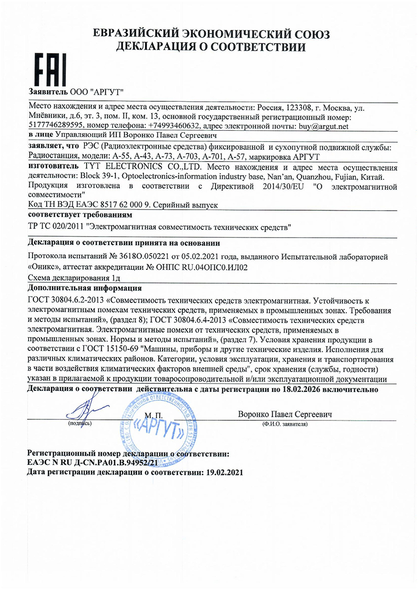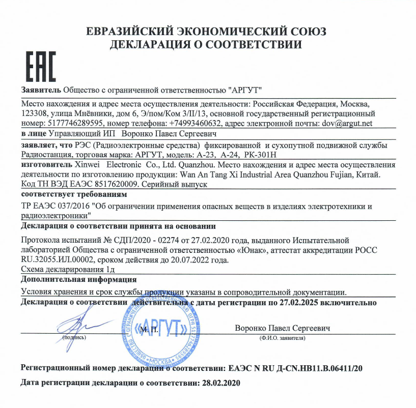 Декларация о соответствии ТР ЕАС 037/2016 радиостанций АргутМодели: А-36, А-25, А-41, А-43, А-44, А-45, А-74, РК-301М, А-54, А-24, РК-201М, А-907