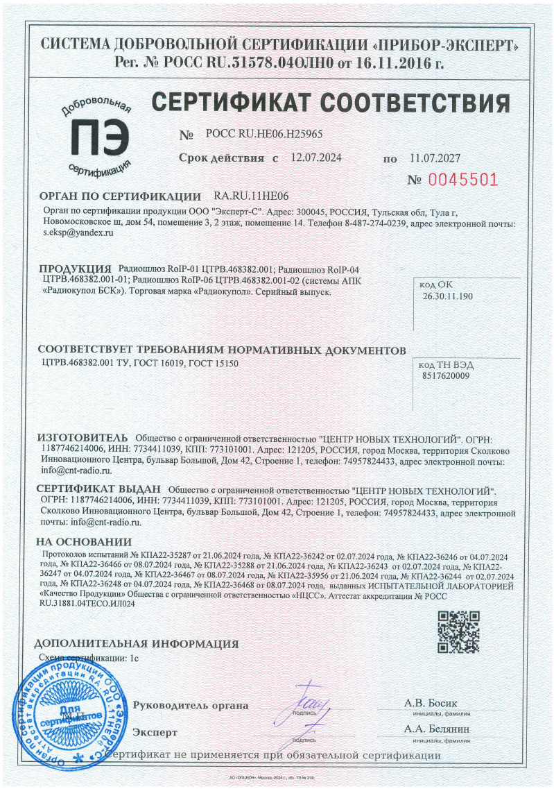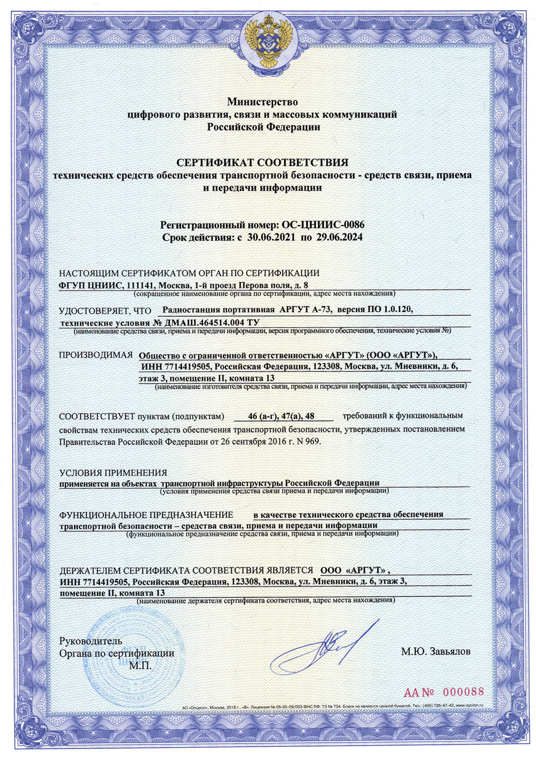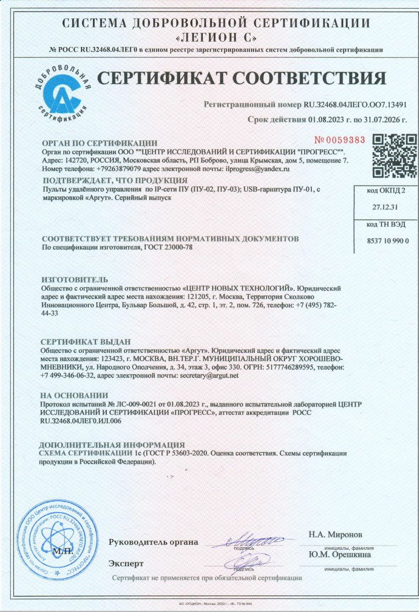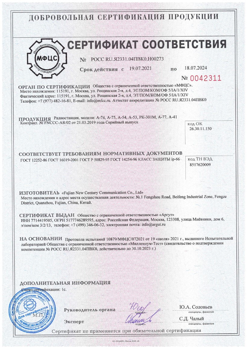 Сертификат соответствия классу защиты IP-66 для радиостанций Аргут А-77, А-74, А-75, А-54, А-53, А-41, РК-301М